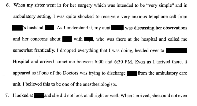 The anesthesiologist who performed the case (Dr. D) heard about the events and went to see the patient in the hospital. She had a discussion with the family and wrote an email to the second anesthesiologist (Dr. G) which is what was referenced in the above affidavit.