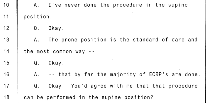 The GI physician was questioned about ERCP positioning.