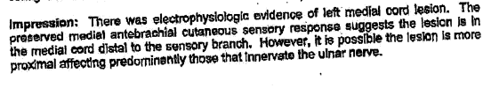 Using nerve stim the anesthesiologist elicited biceps/triceps twitch, but the injury was localized to the medial cord- even ulnar nerve specifically per EMG. Those two findings are at odds with one another. That said, a total of 40ml were injected so I am sure the needle moved around quite a bit to get all that volume in. The volume amount was not primarily criticized here though, but instead the depth of sedation was the focus.