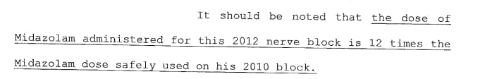 This is not the first case I have seen where a larger sedation amount is required for a patient and there is an injury. Proceed with caution should you find yourself giving increasing doses. This previous case dealt with a femoral nerve block, and the argument surrounding the case was the level of consciousness at the time of the block.
