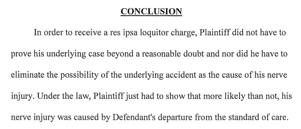Res ipsa loquitur meaning “the thing speaks for itself.” It has a lower burden of proof. Look at his claw hand, what else could it be? One element of this doctrine is there can be no contribution from the part of the plaintiff. The defendants argued that the patient both injured his elbow, and it was operated on, so there were multiple contributions from other parties…as is often the case in med mal. The appeal was denied and the original verdict upheld.