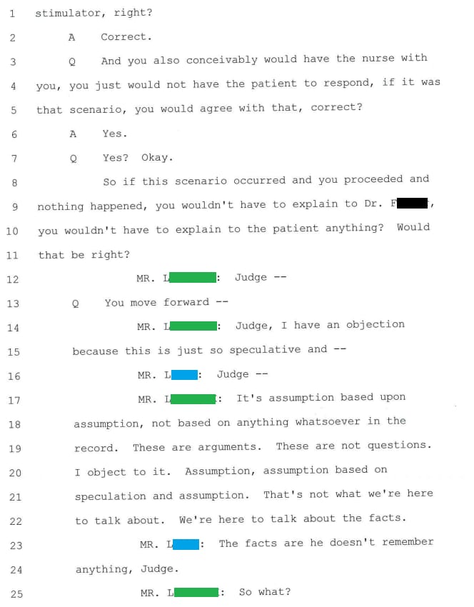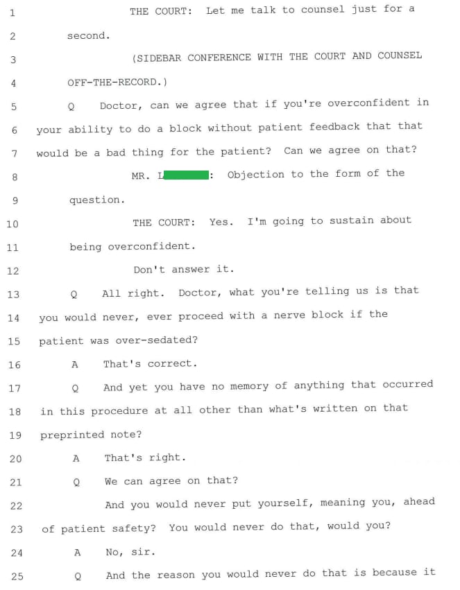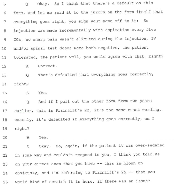 Direct examination is the first questioning for a witness. As a defendant you will be asked questions that will support your case. These will typically be open ended and allow a narrative to build. The goal is to establish credibility and build your story. Direct examination is followed by cross examination where the plaintiff’s attorney will ask questions. These are often yes/no questions, and are designed to steer the conversation in a specific way. This will be a nerve-wracking experience for any defendant. I did crop out some of the beginning of the cross for the sake of length. There were pages and pages spent talking about the time displayed on the ultrasound machine pictures and how it did not match other documentation. Overall this is a good example of what a cross-examination looks like should you find yourself on the stand at trial.
