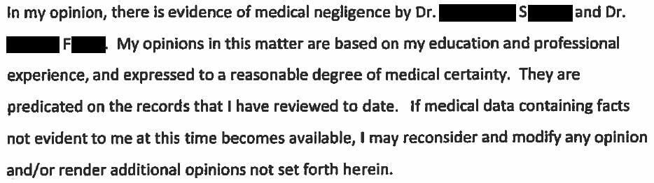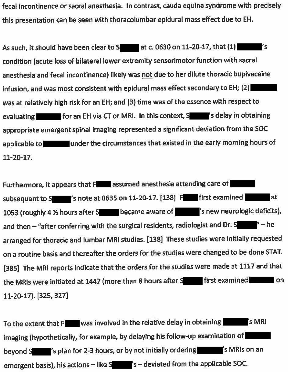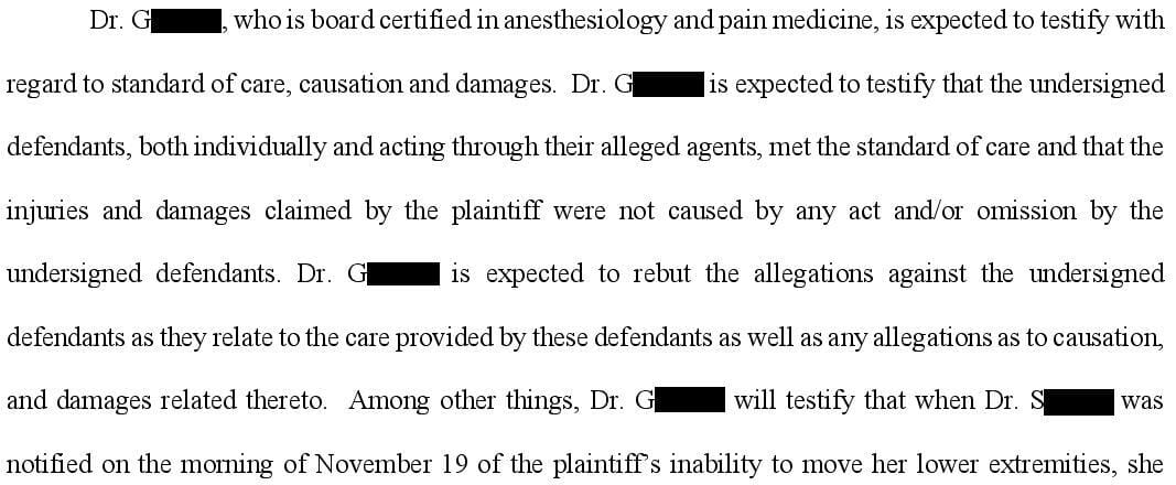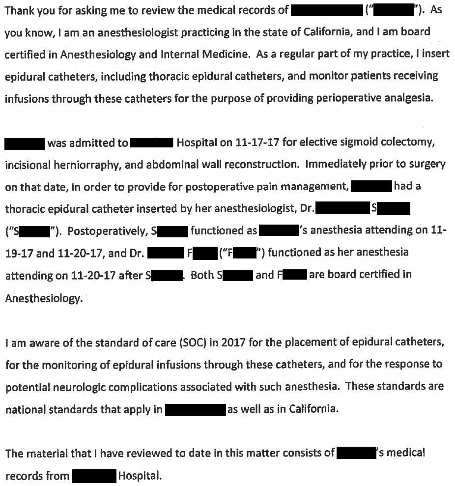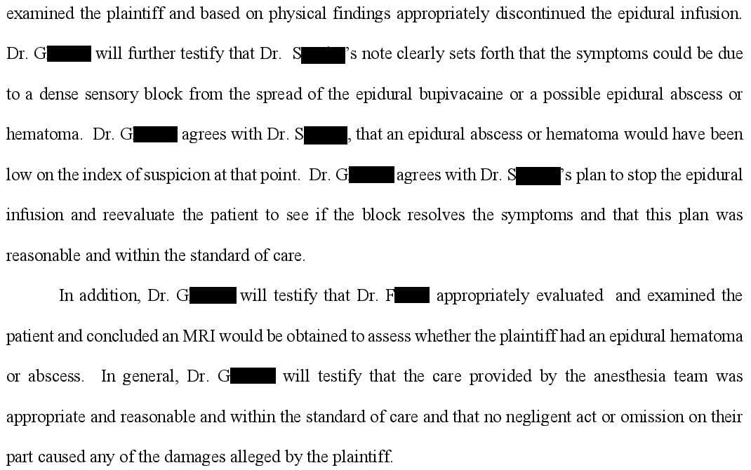 The defense hired numerous experts including an anesthesiologist who wrote this opinion: