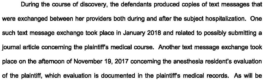 He texted Dr. S, the attending anesthesiologist. The text messages were later subpoenaed during the lawsuit and are shown here: