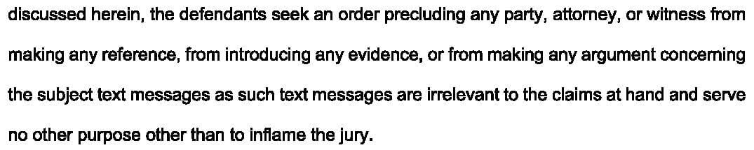 The defense filed a motion asking the judge to prevent the plaintiff from mentioning or displaying the text messages at trial.